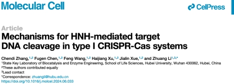 近日,湖北大学生命科学学院与省部共建生物催化与酶工程国家重点实验室李壮课题组在《Molecular Cell》上发表题为《Mechanisms for HNH-mediated target DNA cleavage in type I CRISPR-Cas systems》(I型变体CRISPR-Cas系统通过HNH核酸酶实现靶DNA精准切割的工作机理)的研究论文。该研究发现,crRNA介导的靶DNA定位和靶DNA诱导的HNH构象变化是其精准切割靶DNA的关键因素。研究生张晨滴、陈福根、王凤、徐海江和薛佳琳为该论文的共同第一作者,李壮副教授为该论文的通讯作者。