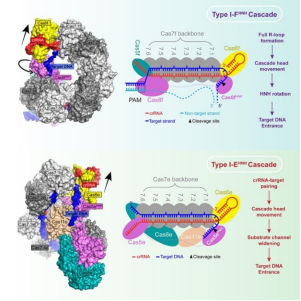 CRISPR-Cas系统广泛存在于细菌和古细菌中,用于抵抗外来核酸的入侵。CRISPR-Cas系统目前可以划分成两大类7种类型,其中I型是原核生物中存在丰度最高的类型,包含多种亚型(I-A到I-G)。I型系统通过形成Cascade 复合物,并招募Cas3核酸酶来实现对靶DNA的降解。最新的生物信息学研究发现了两个I型变体系统(此处命名为I-EHNH和I-FHNH),它们都缺乏Cas3核酸酶但却在核心亚基上融合了 HNH核酸酶结构域,以实现对靶DNA的切割。这两种系统都可以通过重编程在哺乳动物细胞中产生突变,显示出了巨大的基因组编辑潜力。然而,它们的工作机理一直不清楚。
